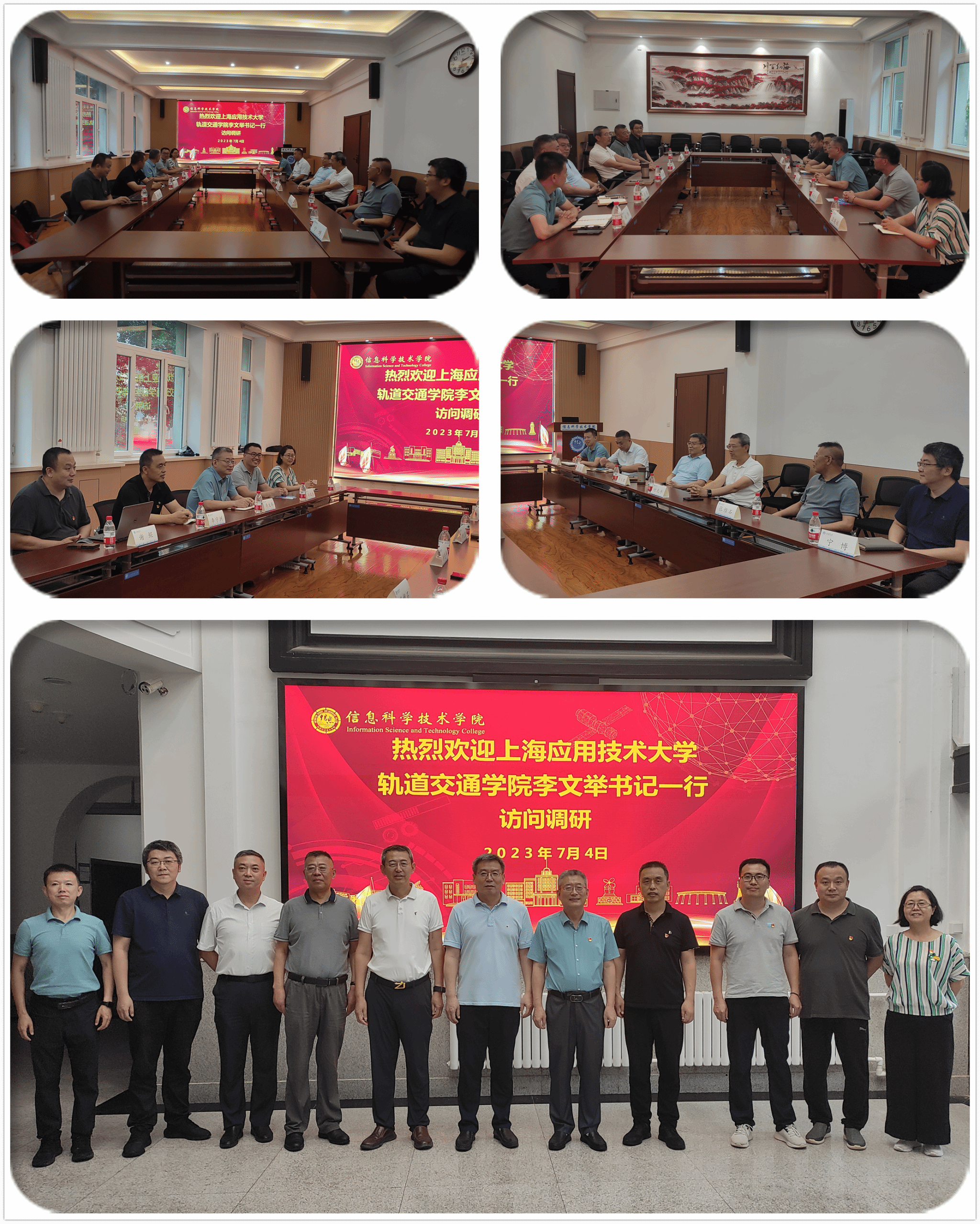 7月4日,上海应用技术大学轨道交通学院学院李文举书记一行来我校信息科学技术学院调研交流。轨道交通学院学院副院长李宁洲、车辆工程系系主任孙效杰、车辆工程系副主任谢鲲、车辆工程系副教授卫晓娟;学院党委书记李生君、院长付先平、科研副院长符策、教学副院长宁博、行政副院长白阳、教授张维石参加了会议。会议由付先平主持。