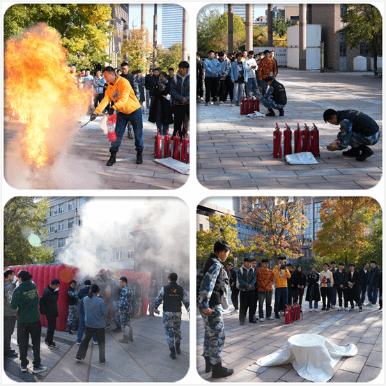 实训环节在电航楼前广场进行。以退伍大学生为主体组建的“信火先锋队”担任讲解和保障工作。在“信火先锋队”队员们的引领下,受训师生进行了灭火器、灭火毯实操演练,并有序进行了模拟夜间断电状况下的狭窄通道疏散演练。