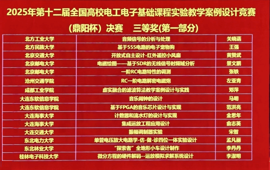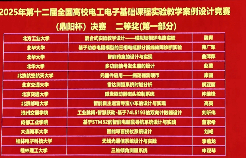 近日,第十二届全国电工电子基础课程实验教学案例设计竞赛(鼎阳杯)于哈尔滨工程大学落下帷幕,公布了获奖名单。我校教师获得全国二等奖1项,三等奖2项,获得北部赛区一等奖3项,二等奖5项,三等奖4项,学校获得优秀组织奖1项。