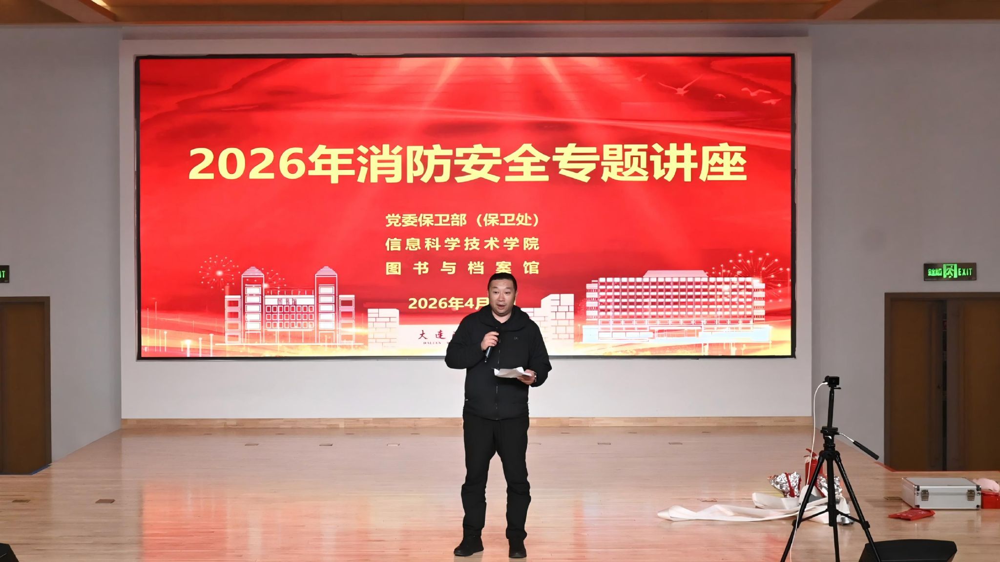 活动特别邀请了大连高新园区消防救援大队大队长高相臣等消防方面的一线专家作主题讲座和现场演练。主讲人高相臣结合高校消防工作的特殊性,针对图书馆人流量密集,以及信息科学技术学院学生规模庞大、科研实验室数量多、教学区、科研楼与学生公寓分布范围广的实际情况,带来了题为“学消防知识,守一生平安”的专业讲解。