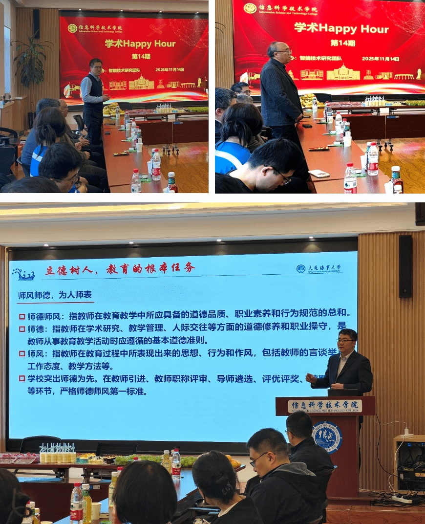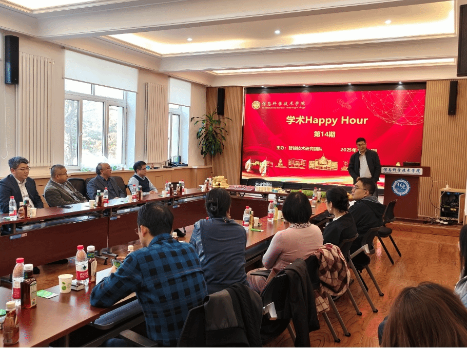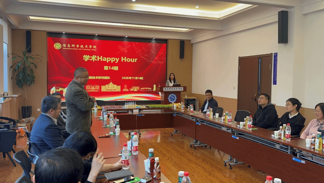 2025年11月14日下午,信息科学技术学院在电航楼218成功举办了“智汇信息,携手启航”的第14期“Happy Hour”学术活动。本次活动由智能技术研究团队主办,活动邀请了学院领导致辞以及学院的教职工出席。本期活动由智能技术研究团队青年教师段镁钰主持。