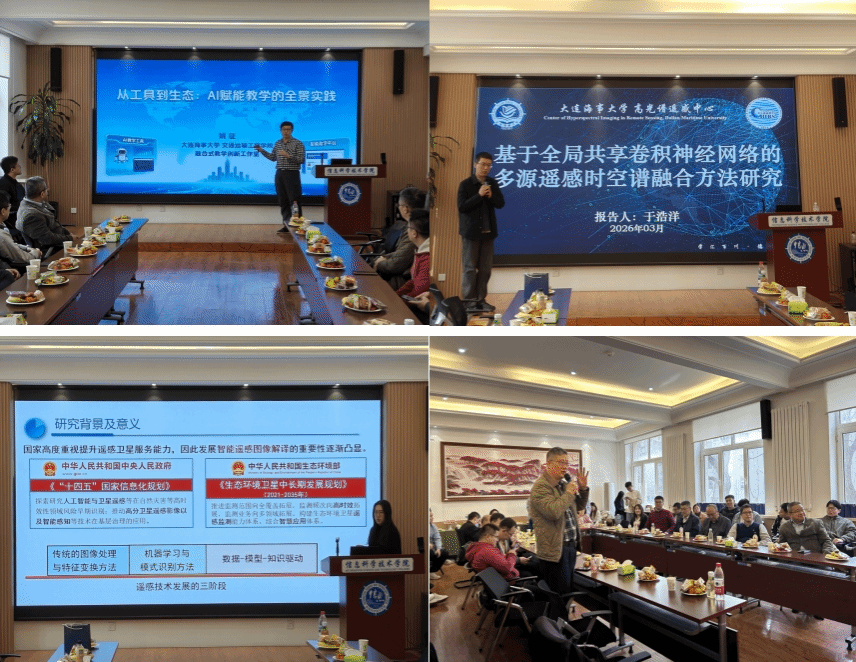 遥感信息处理与应用团队于浩洋老师和王琳琳老师分别作科研专题报告。于浩洋老师围绕多源遥感领域的关键问题与发展趋势,分享了团队在相关方向上的最新研究进展;王琳琳老师则聚焦智能遥感图像解译,系统介绍了其在模型方法与应用实践方面的研究成果。两场科研报告内容前沿、思路清晰,进一步拓展了与会教师的学术视野。各位教师的精彩分享引起了与会人员的浓厚兴趣,现场交流充分、互动热烈,营造了良好的学术交流氛围。