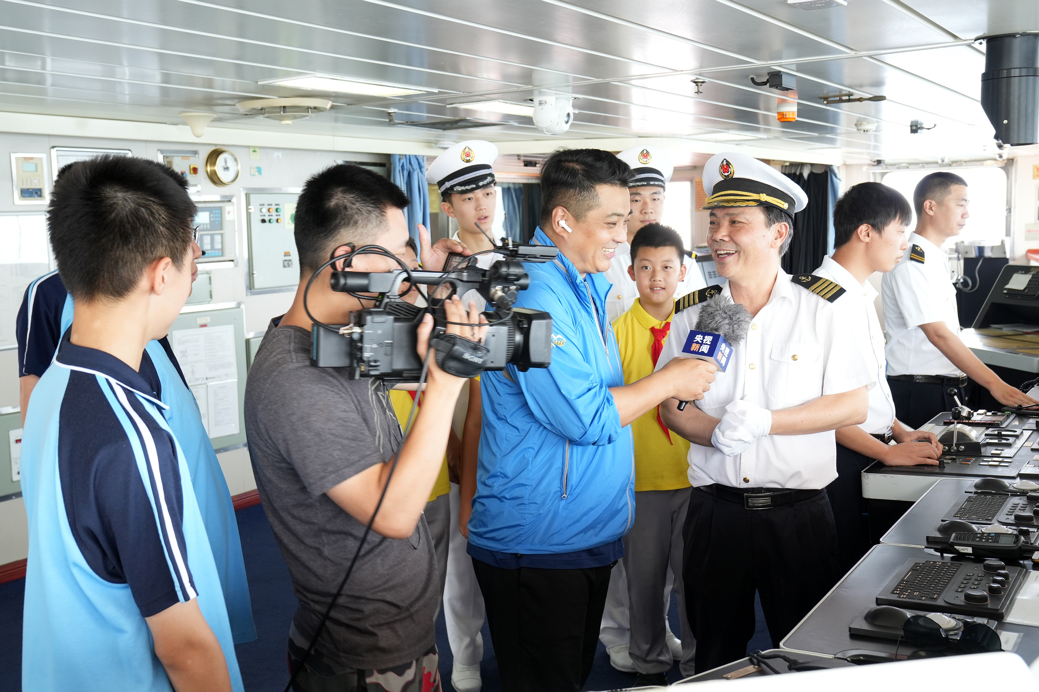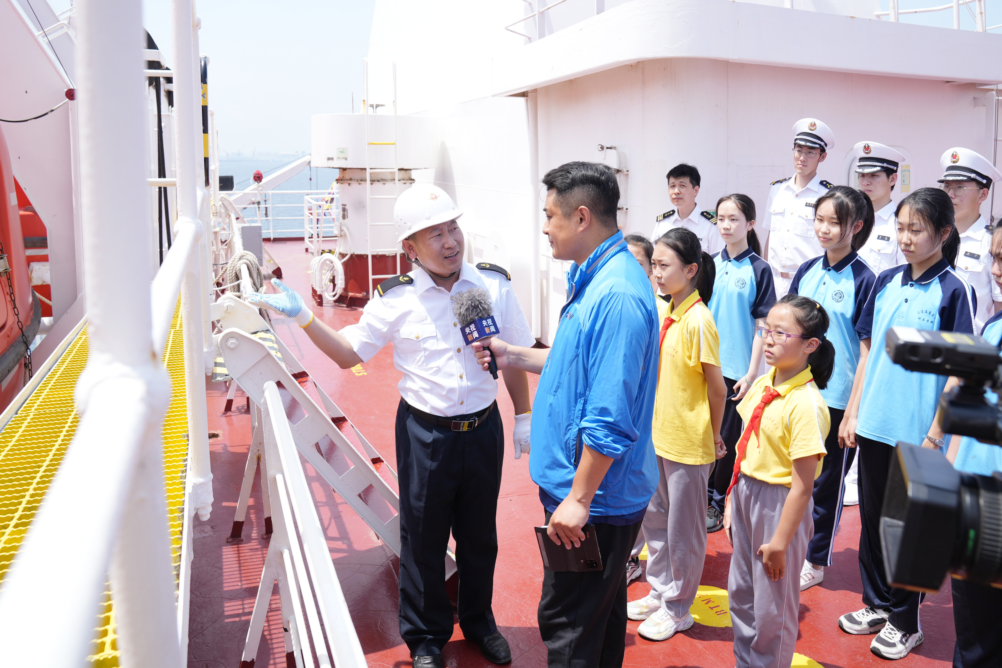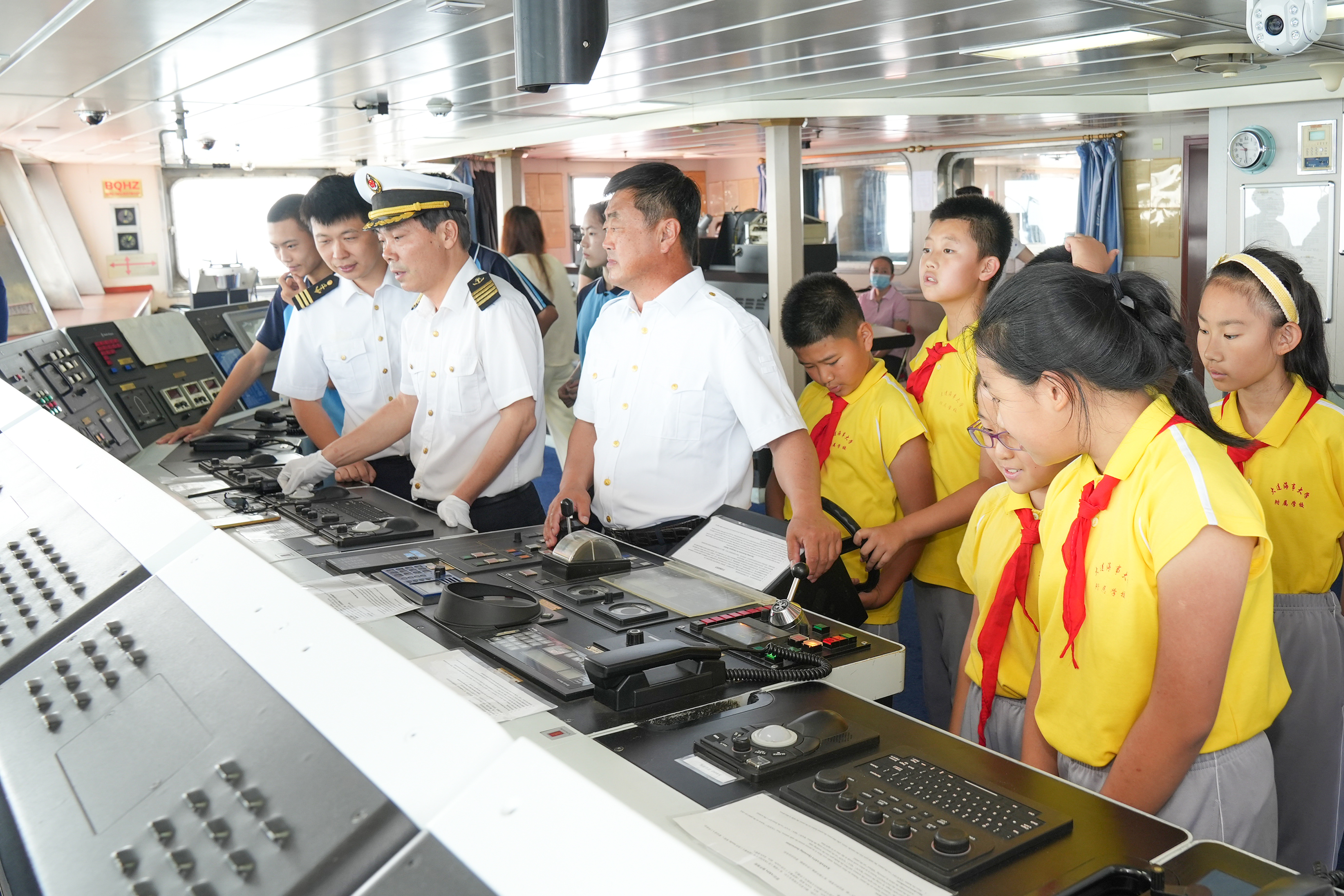 “育鲲”轮船长陈世才进行船舶知识科普。他带领学生参观船舶驾驶台,介绍航海时钟、电罗经、磁罗经、雷达等操作台核心设备,并讲解纸质海图和电子海图的不同作用以及发展历史。