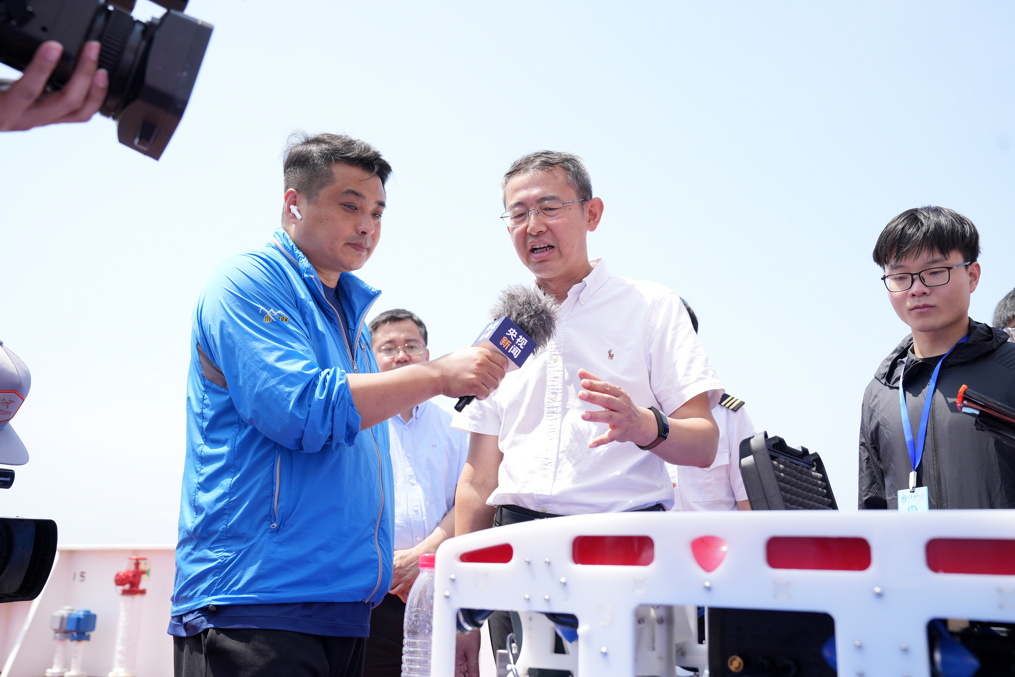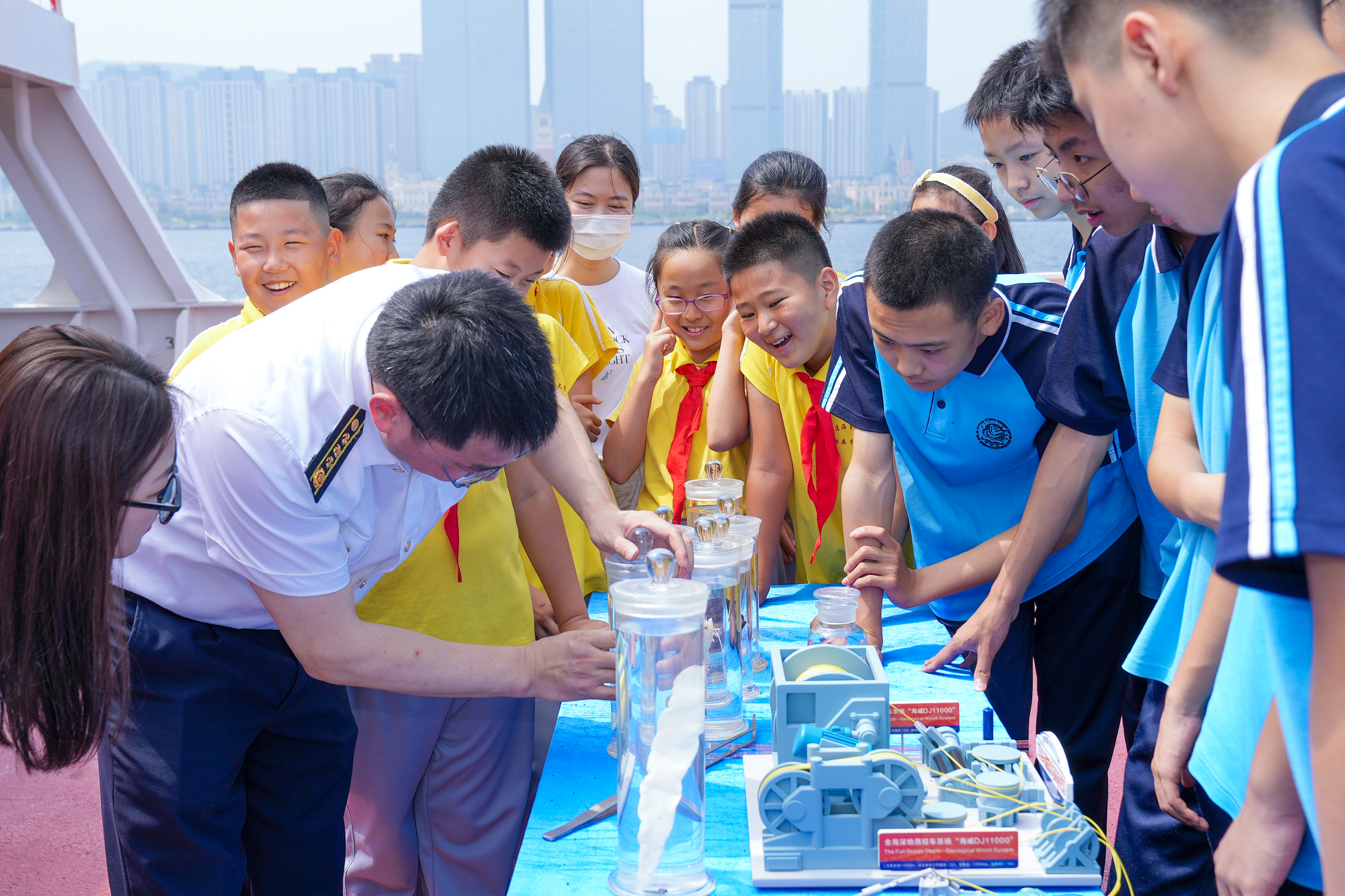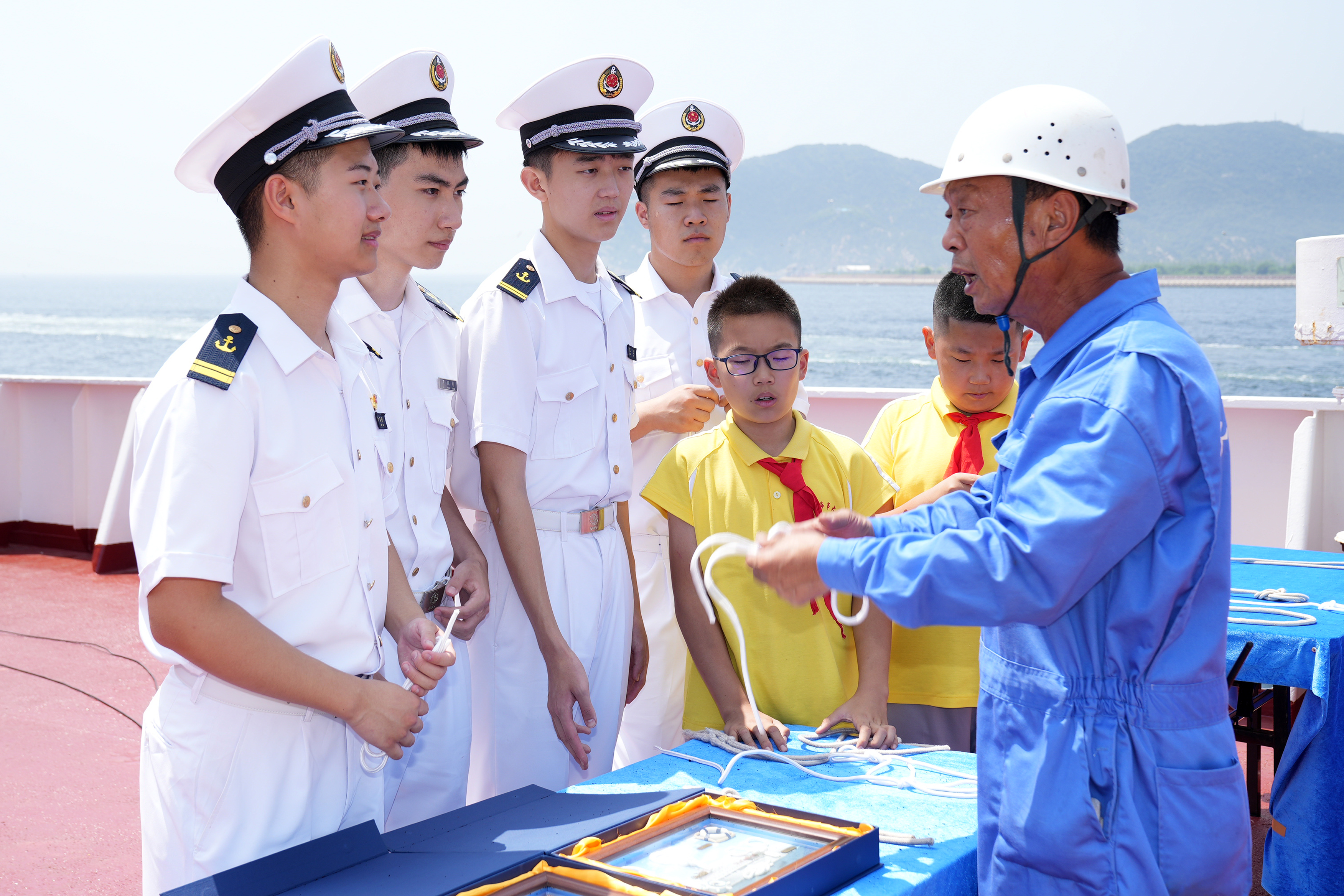 “育鲲”轮船长陈世才进行船舶知识科普。他带领学生参观船舶驾驶台,介绍航海时钟、电罗经、磁罗经、雷达等操作台核心设备,并讲解纸质海图和电子海图的不同作用以及发展历史。