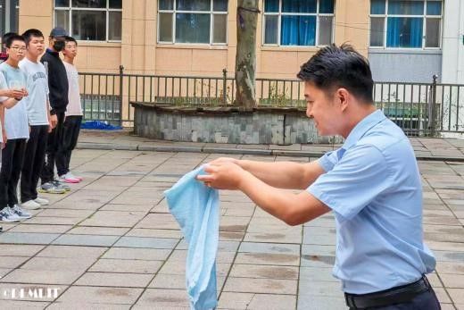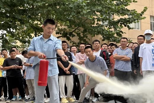本次演习分为三个阶段。第一阶段,随着哨声响起,各中队指导员和学生干部第一时间组织学生以寝室为单位有序撤离,并用湿毛巾捂住鼻子,然后低头弯腰走出宿舍,在楼下平台集合。第二阶段,高昕教官结合学院的消防环境现状,剖析了最新火灾案例,围绕火灾的预防、逃生,提醒同学注意预防火灾,如何正确用湿毛巾捂住口鼻,采取正确姿势快速有序撤离“火灾”现场。第三阶段,通过现场示范初起火源扑灭方法和部分人员轮流实操,让在场人员充分掌握各类消防器材的使用要领。最后,参与演练的师生学习了如何正确地使用灭火器。